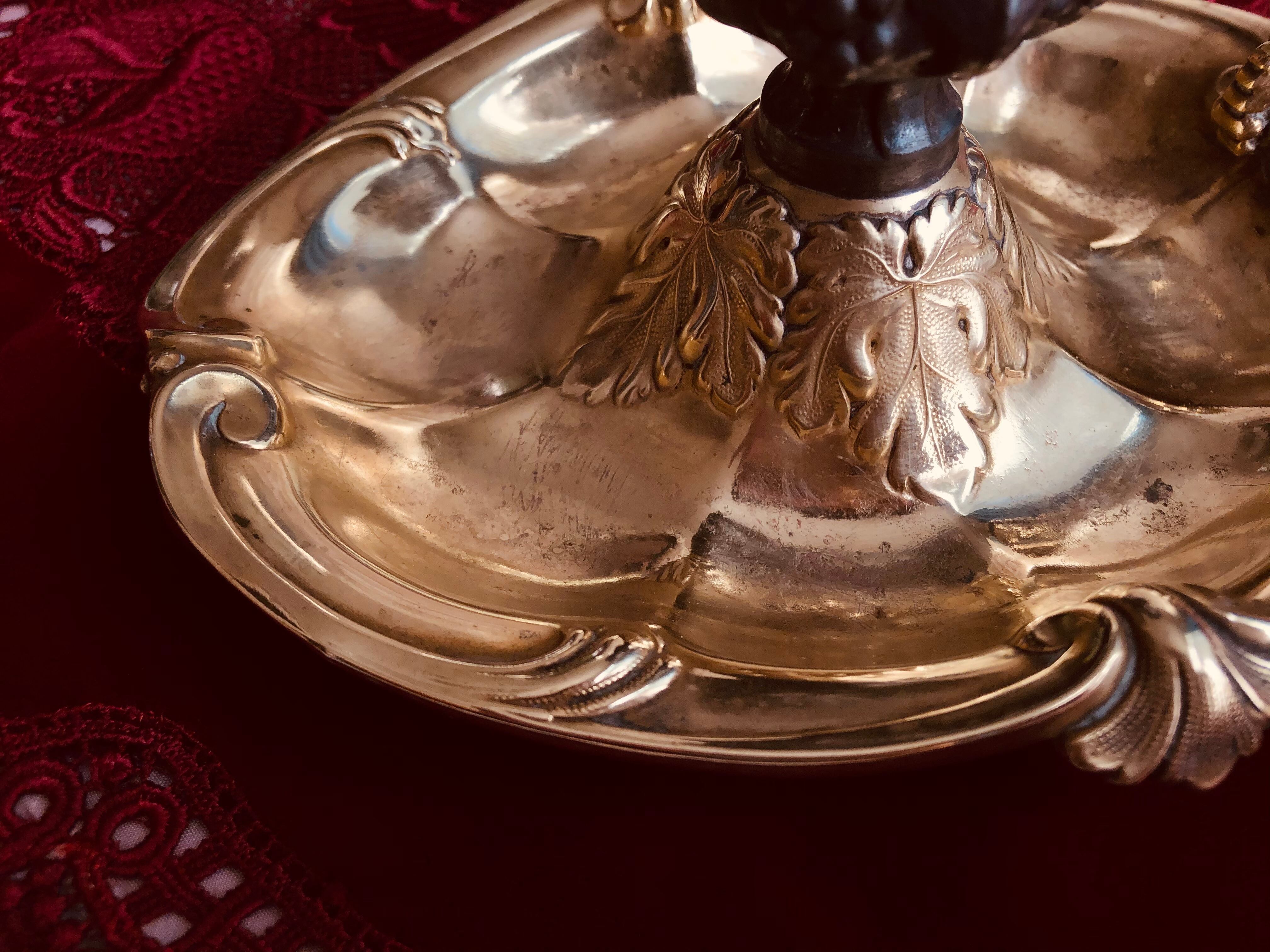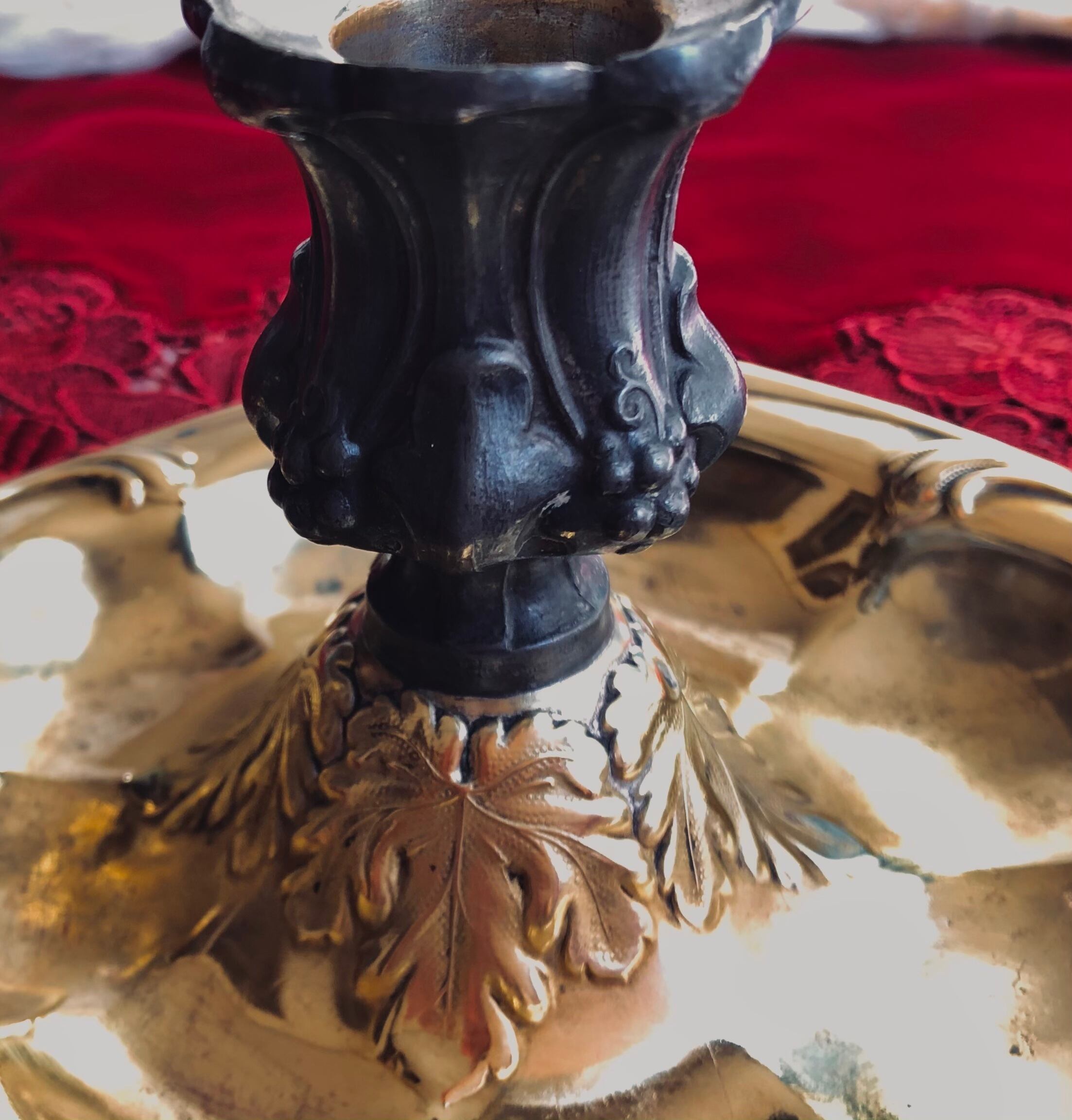 蝋燭に火を灯すとぶどうの葉が施された金色の受け皿が炎のゆらめきに照らされます。スタンドにはぶどうの房が実り古典的で華やかな印象です。